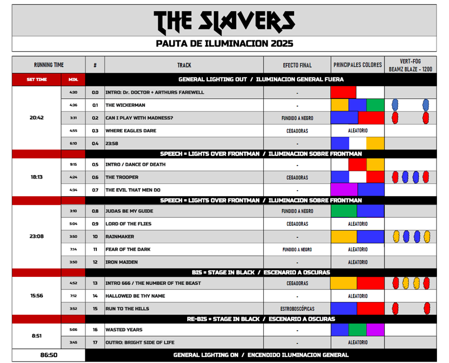 Este año, con la llegada de Eddie the Wizard y la inclusión de temas como Phantom of the Opera, Powerslave, Stranger in a Strange Land y Tailgunner, hemos diseñado nuevas rutinas de iluminación para nuestro espectáculo "Slave Hunters Tour 2024" con el que nos presentaremos en escenarios de "alto standing" como los de Sala Salamandra, La Mirona, Totem, MusicBox y Le Klub, siempre bajo el criterio de ofrecer un show con identidad propia soportado por una producción visual realizada por profesionales de acreditada experiencia para generar calidez, sintonía e interacción con los espectadores.